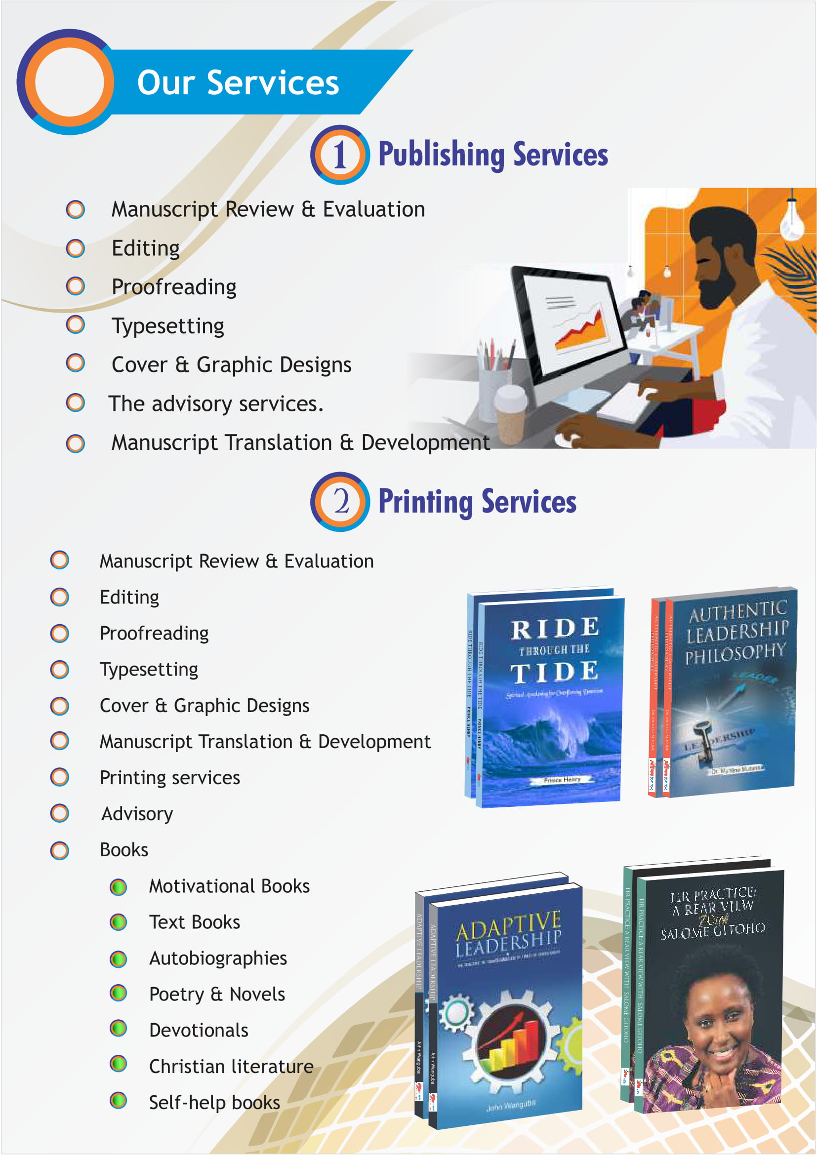 Publishing Services manuscript-review-evaluation manuscript-translation-development cover-graphic-designs proofreading typesetting editing Advisory Services book-pricing book-marketing book-title-selection manuscript-development Printing services magazines calendars letterheads bookmarks flyers diaries motivational-books text-books self-help-books autobiographies poetry-novels christian-literature